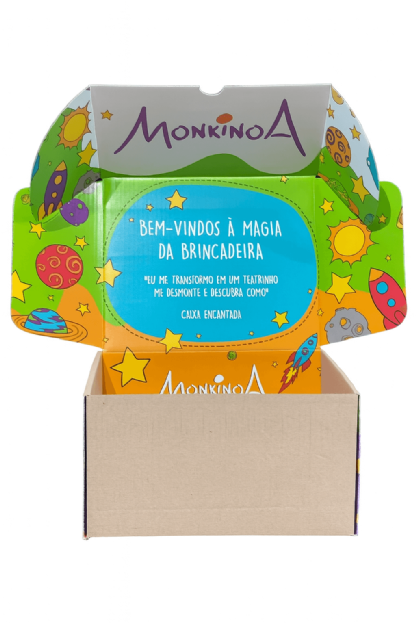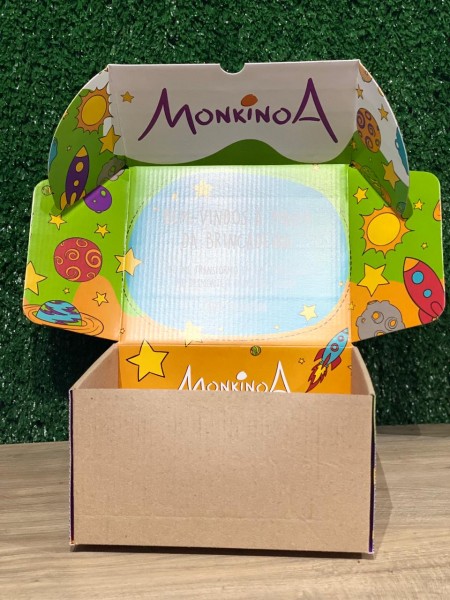 Material: fabricado em papel cartão impressão 4 x 0 cor e acoplado ao micro-ondulado pardo.