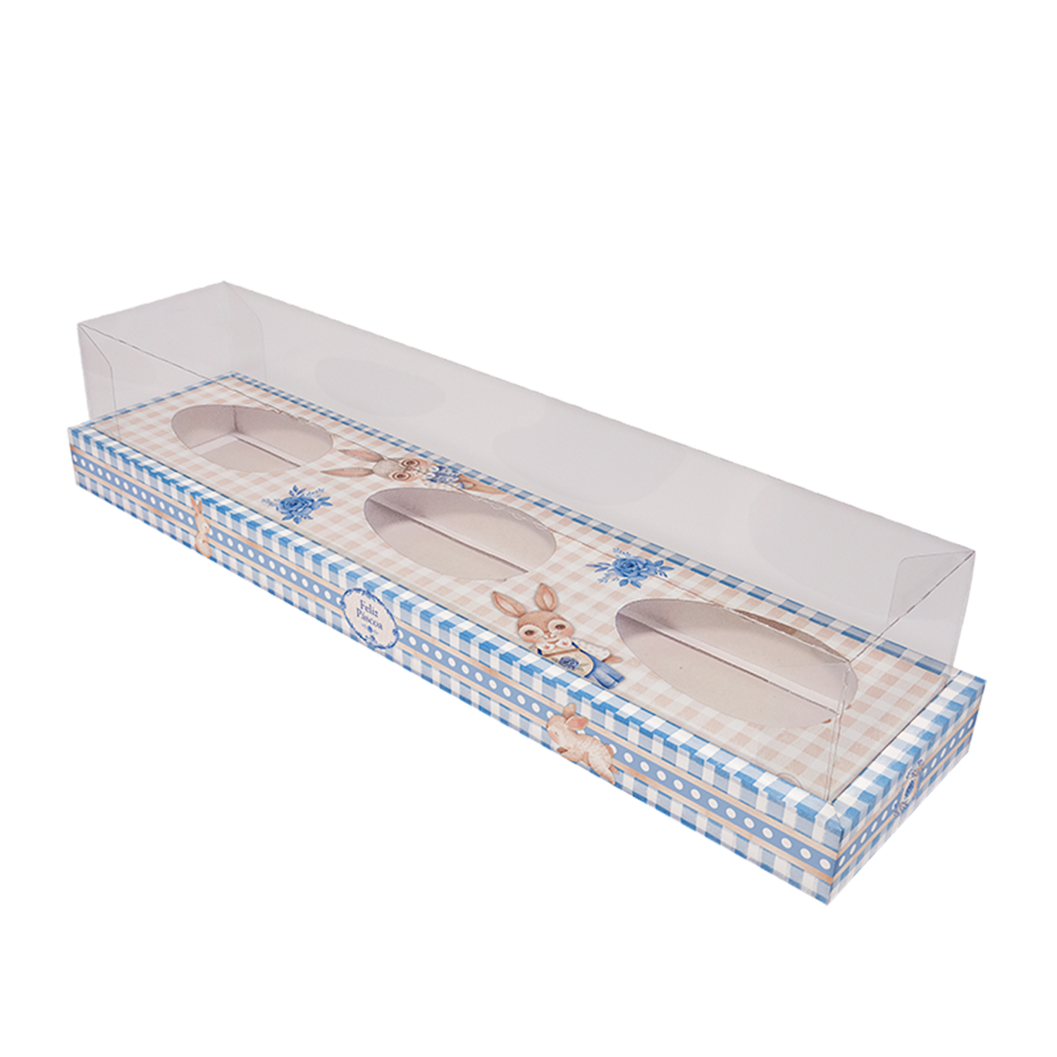 Essa caixa trio é indicada para ovos de 100 a 150 gramas. Ela tem um formato retangular, estreito e comprido.