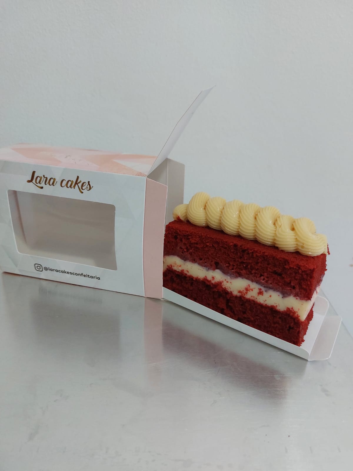 Embalagem fabricada em papel cartão, firme e resistente. A caixa tem um visor transparente para deixar seu produto exposto e atrair o olhar dos clientes. É acompanhada por um berço (suporte) para colocar a fatia de bolo, torta ou outro produto.