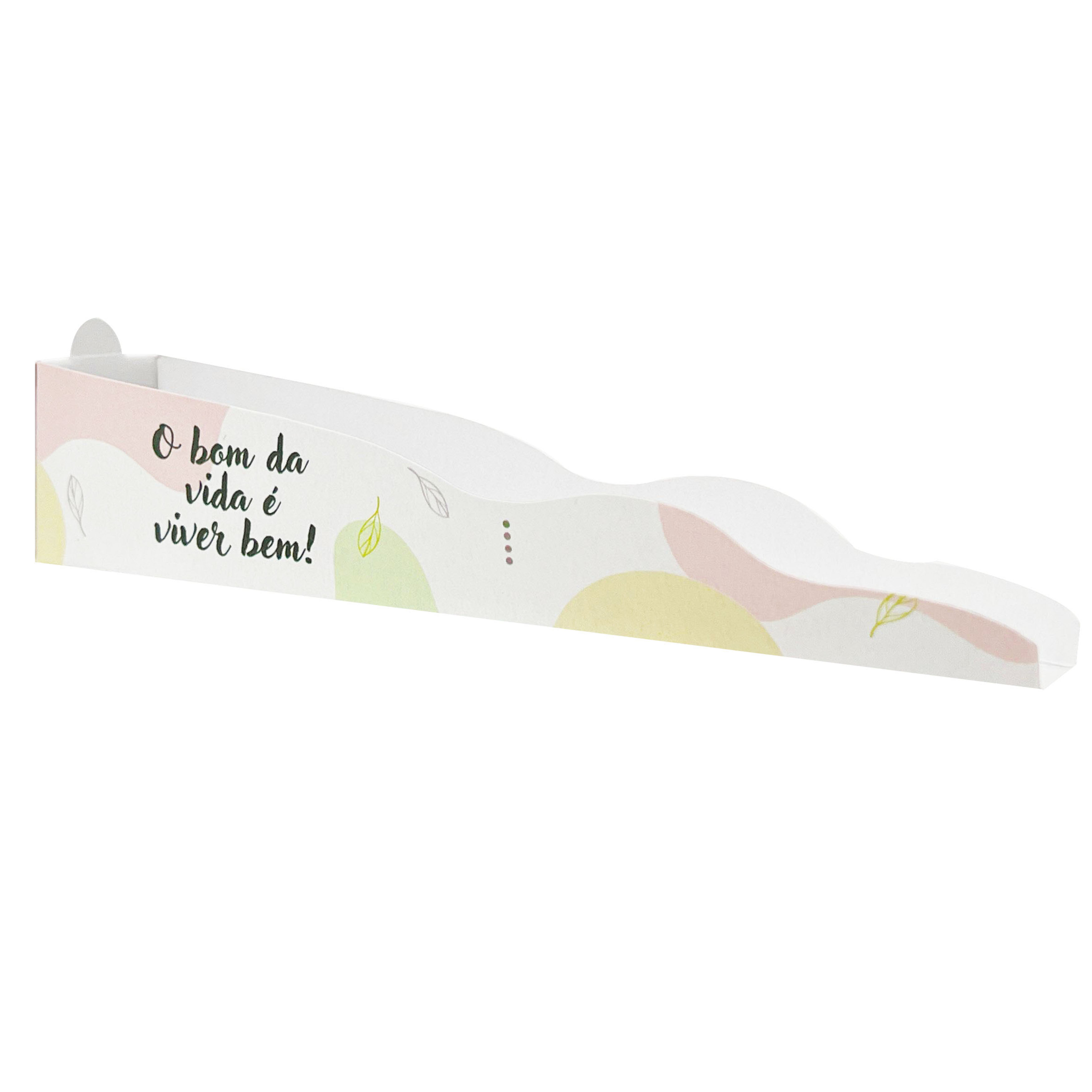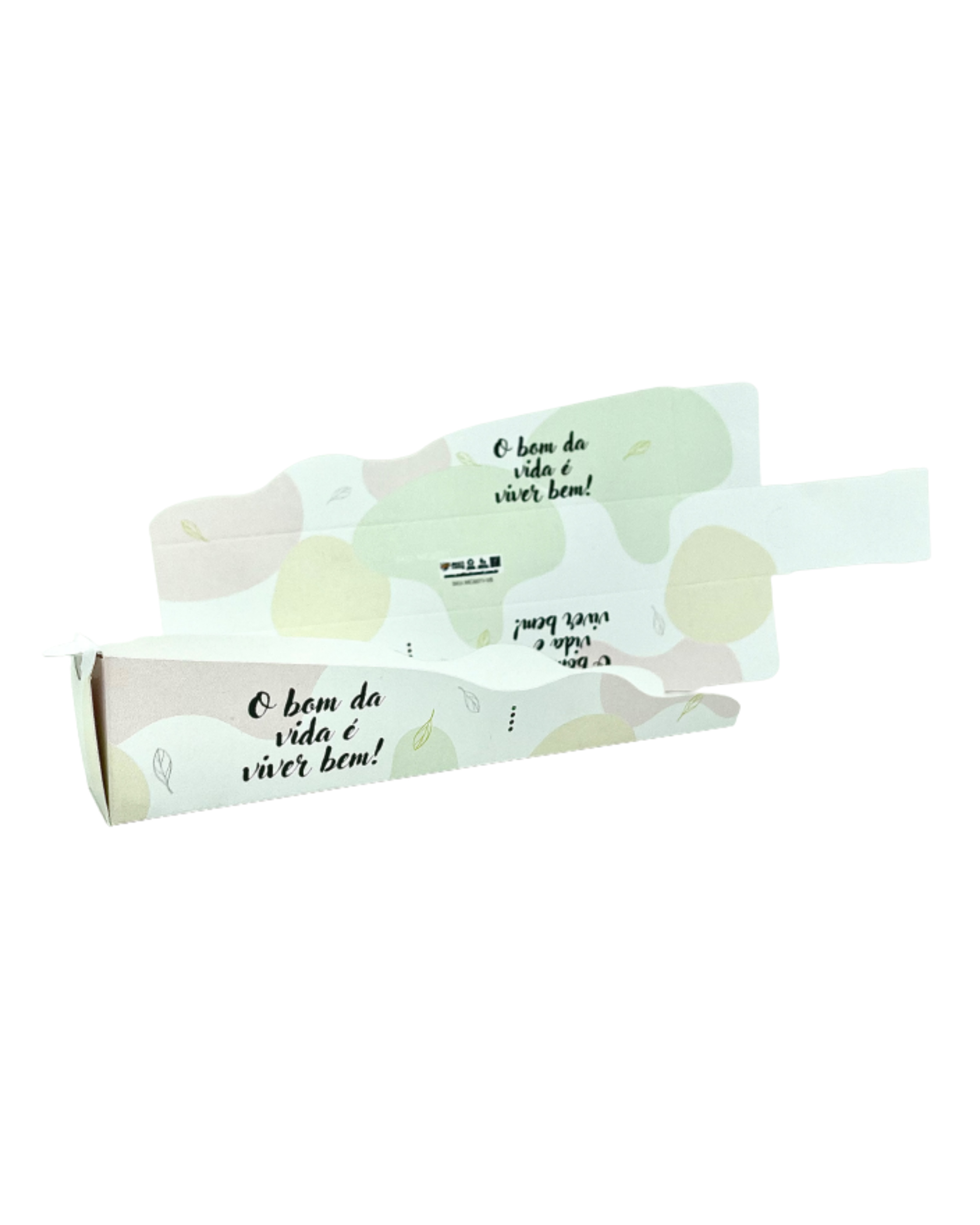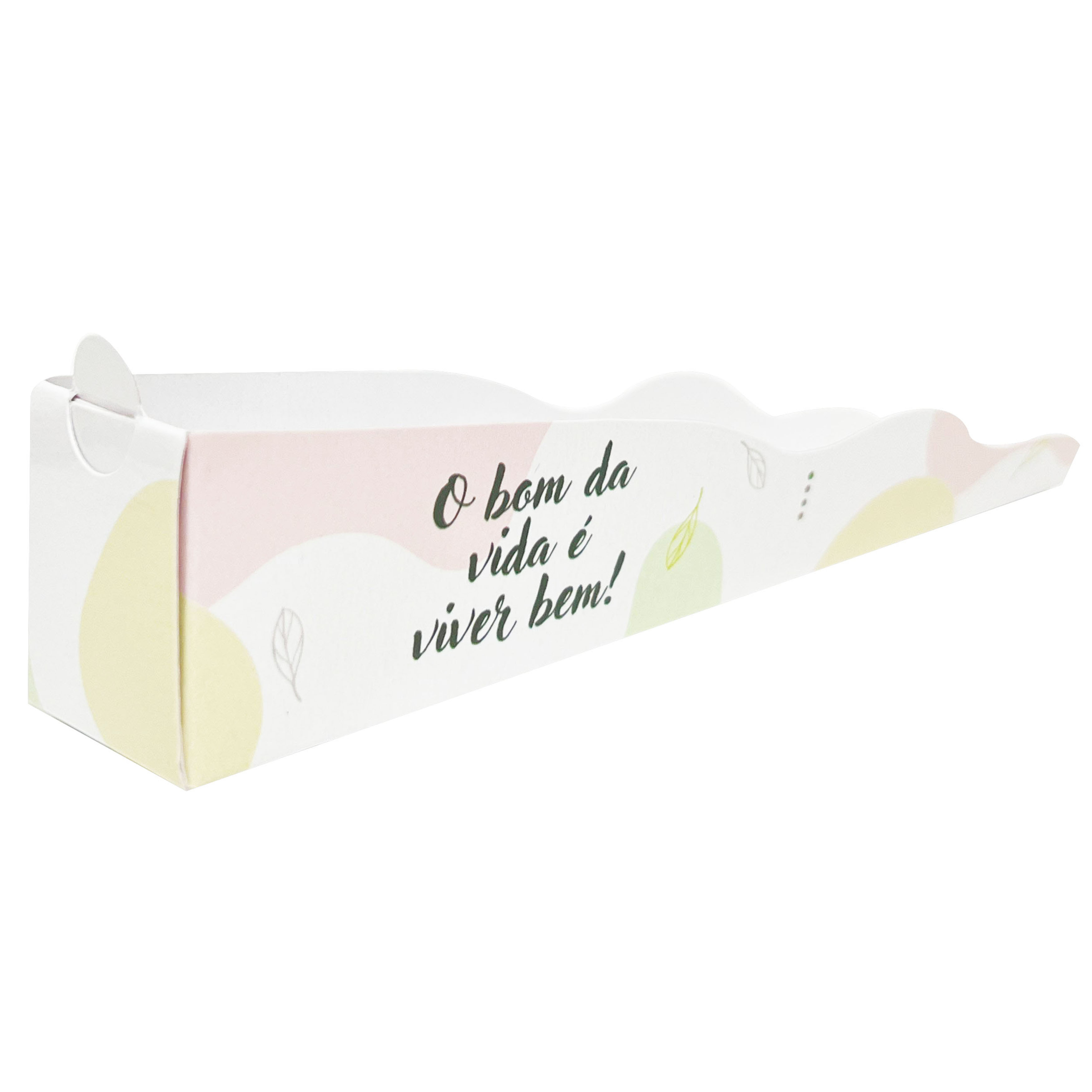 A embalagem é impressa em papel cartão 250 gramas, com alta qualidade de impressão. Tem duas opções de estampa, que você pode escolher: o tema “Viver Bem” e o tema “Com Doçura”.