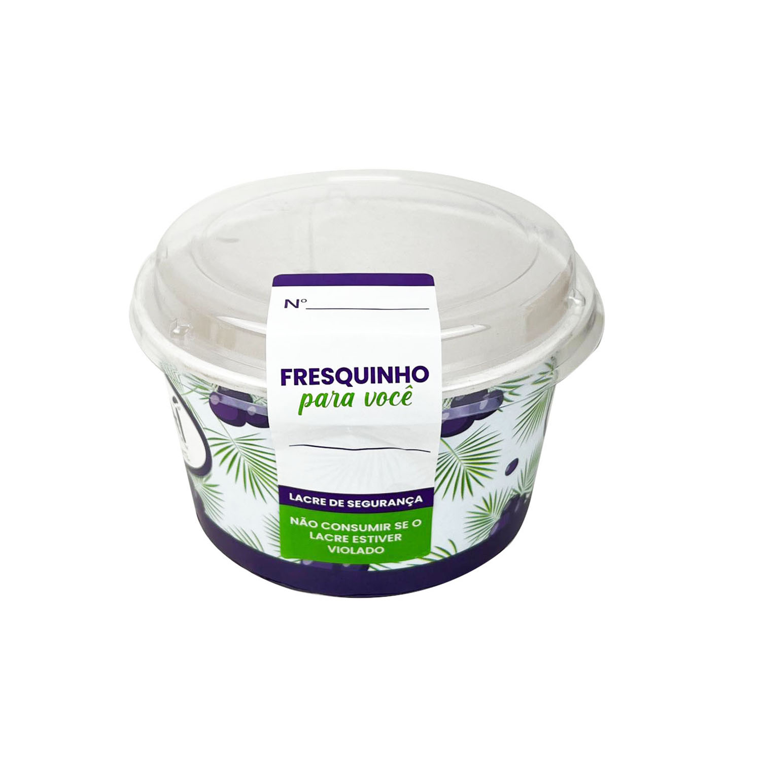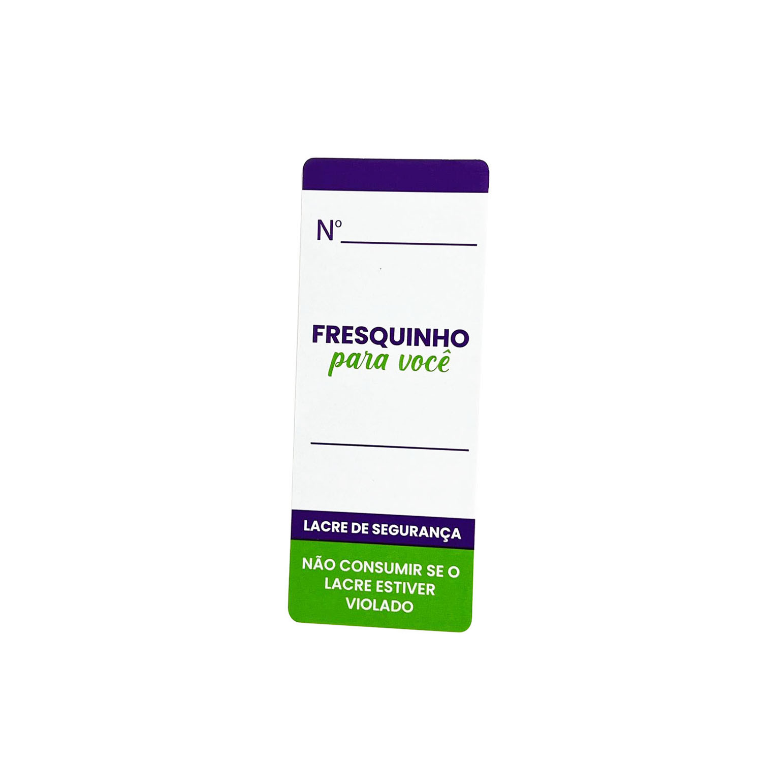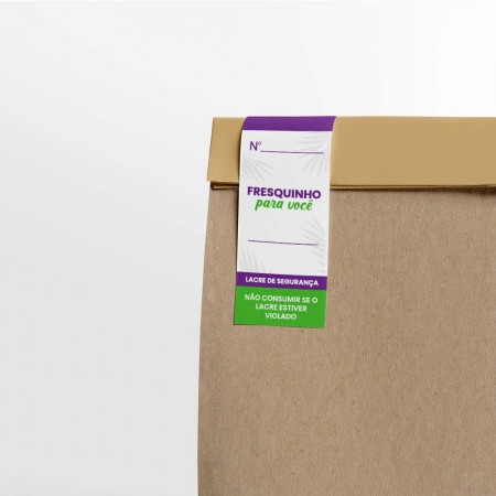 No lacre de segurança vem escrito: “Fresquinho para você – lacre de segurança – Não consumir se o lacre estiver violado”. Ele é indicado para sacos, sacolas e embalagens que carregam alimentos em geral. Também serve para as porções vendidas em potes, como açaí, sorvete, doces, salada de frutas, etc.