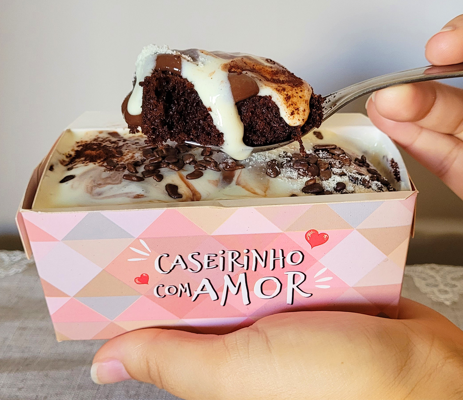 Esse modelo tem 11,5 x 5 x 5,5 cm e capacidade de massa crua de aproximadamente 100 gramas. A estampa delicada tem um tom de rosa e bege, com a frase “Caseirinho com amor”, inspirada em produtos artesanais.