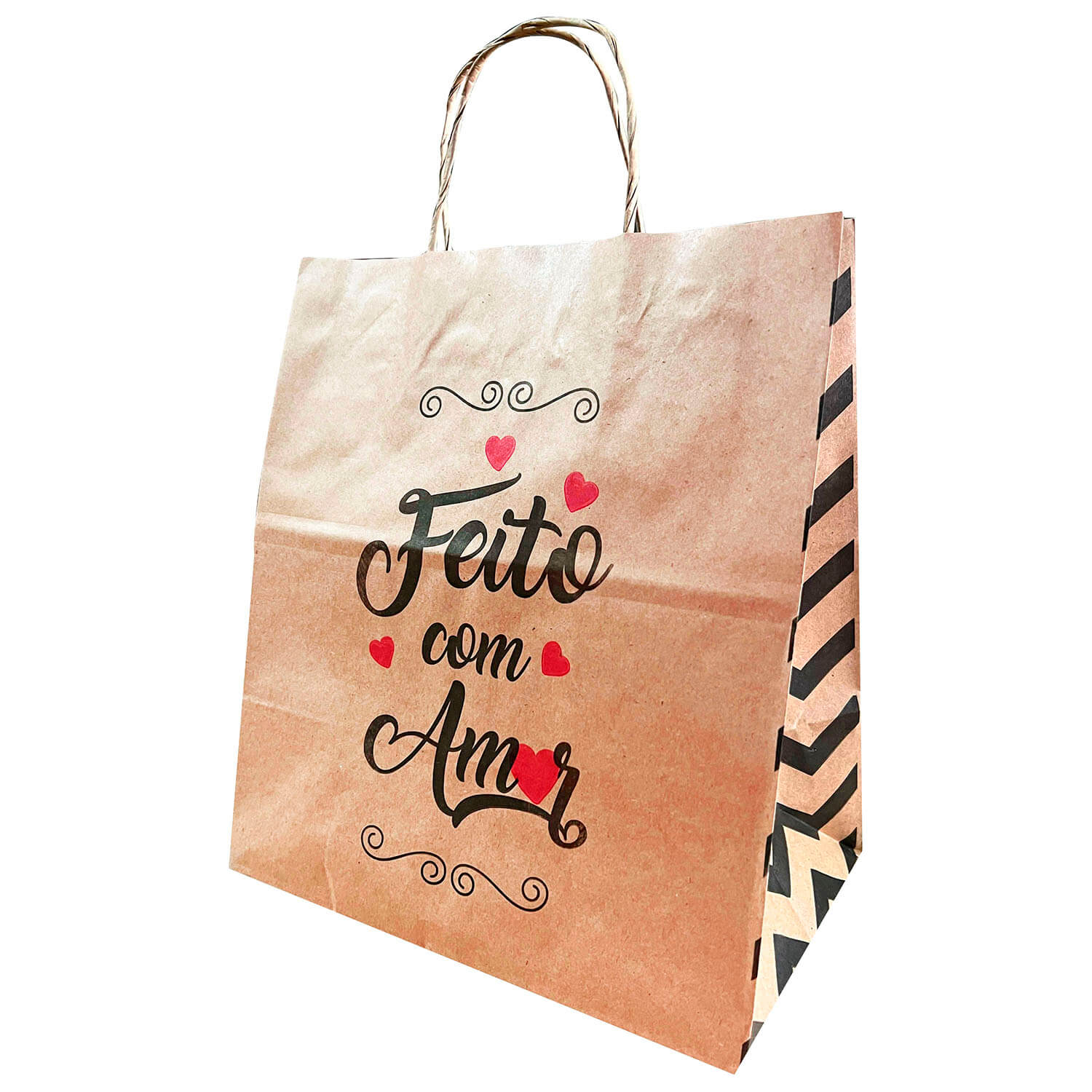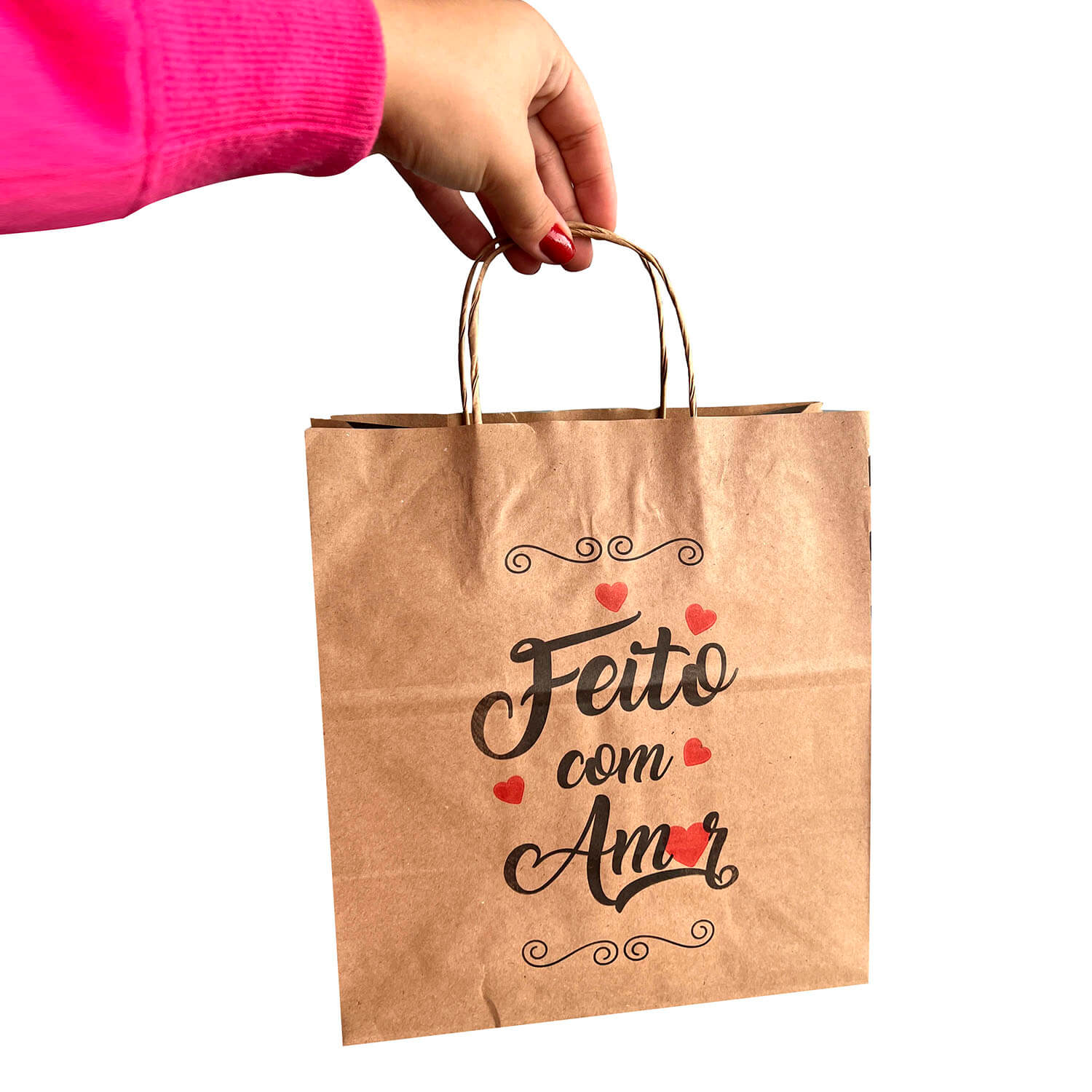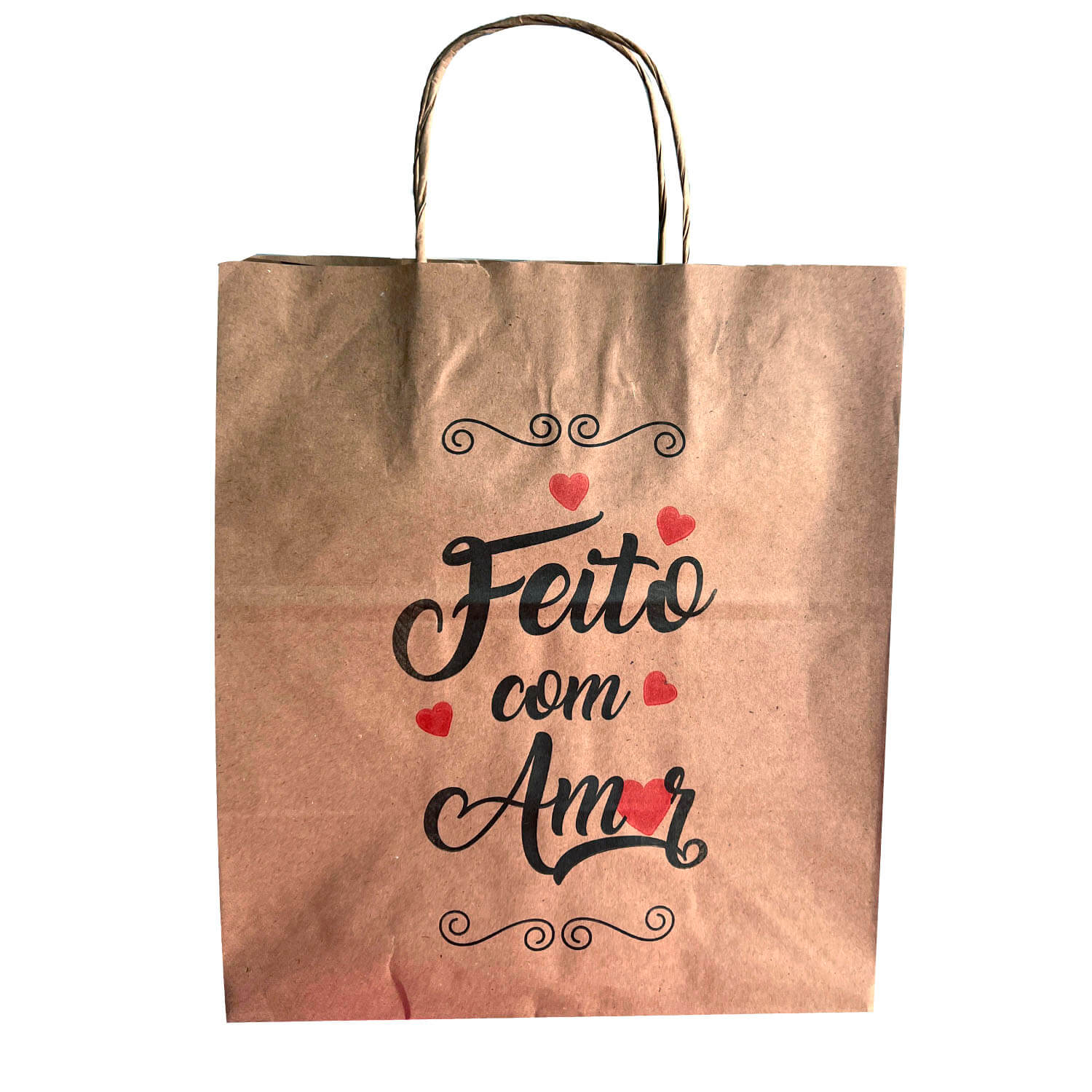 Sacola com alça, 80gr, estampada com a frase “Feito com Amor”. Pensada para produtos artesanais, alimentos, delivery, lojas e muito mais.