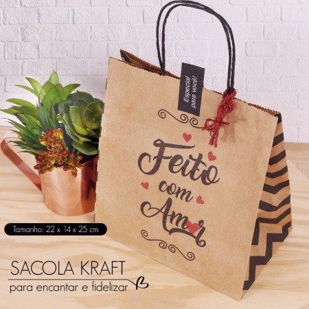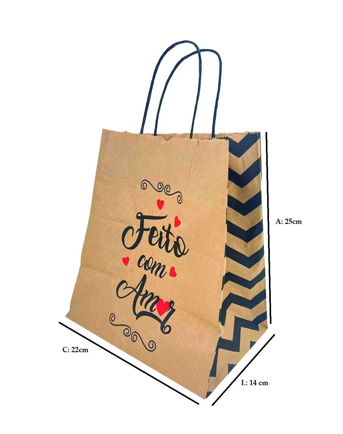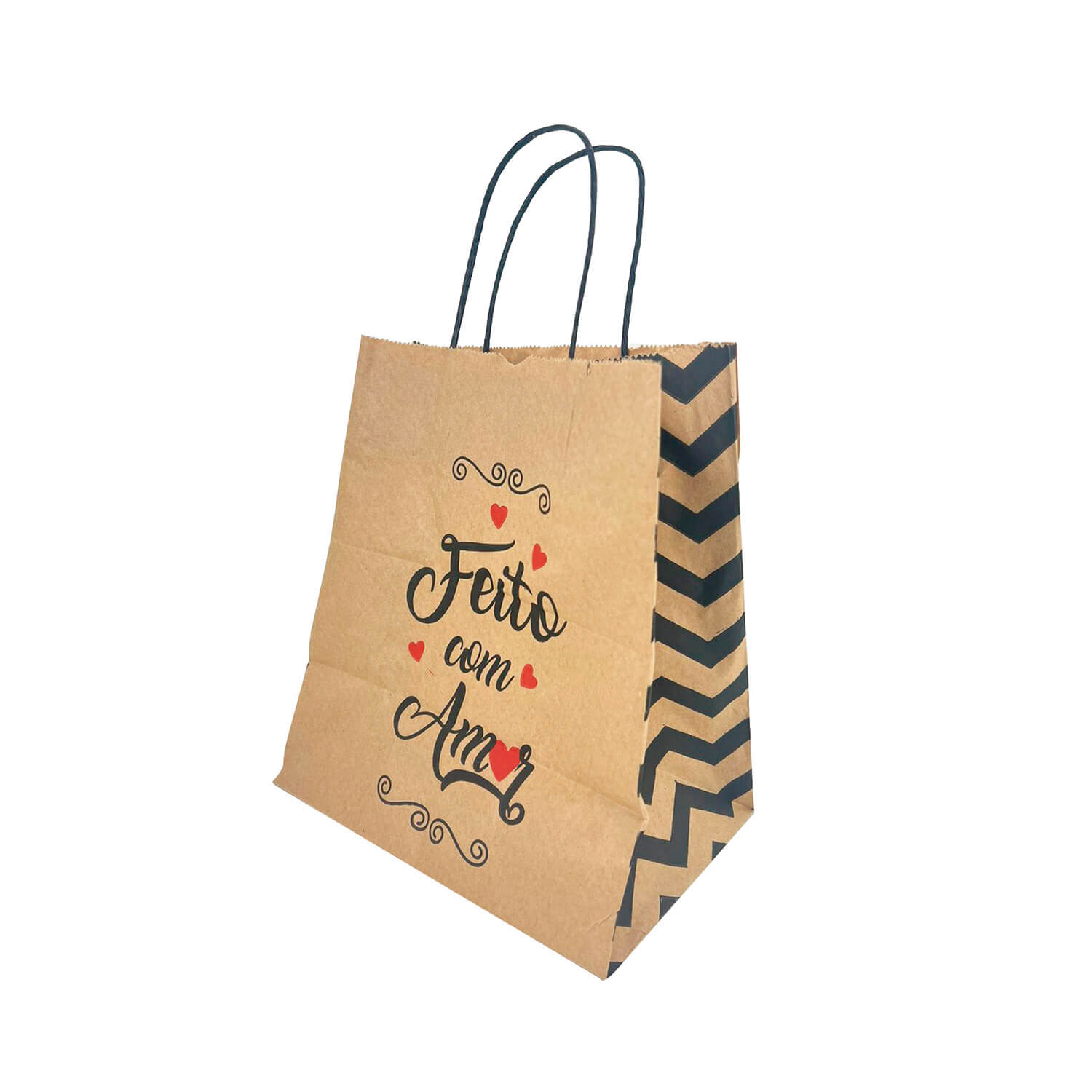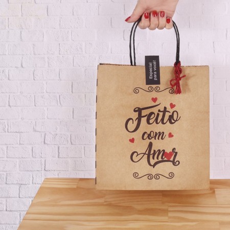 Sacola com alça, 80gr, estampada com a frase “Feito com Amor”. Pensada para produtos artesanais, alimentos, delivery, lojas e muito mais.