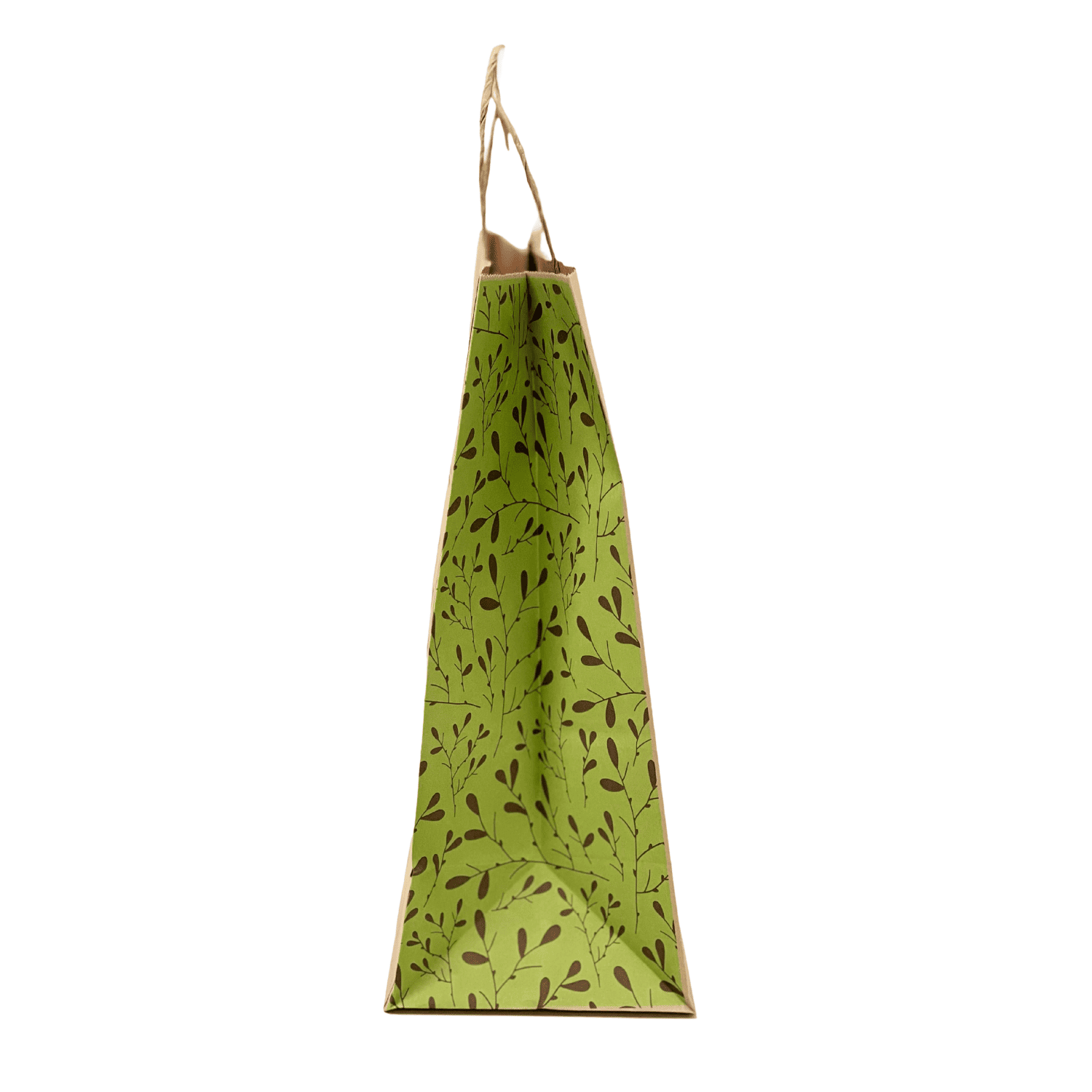 A alça é feita de papel torcido cor Natural, colada com cola vegetal nas laterais internas. Material resistente e prático para carregar.