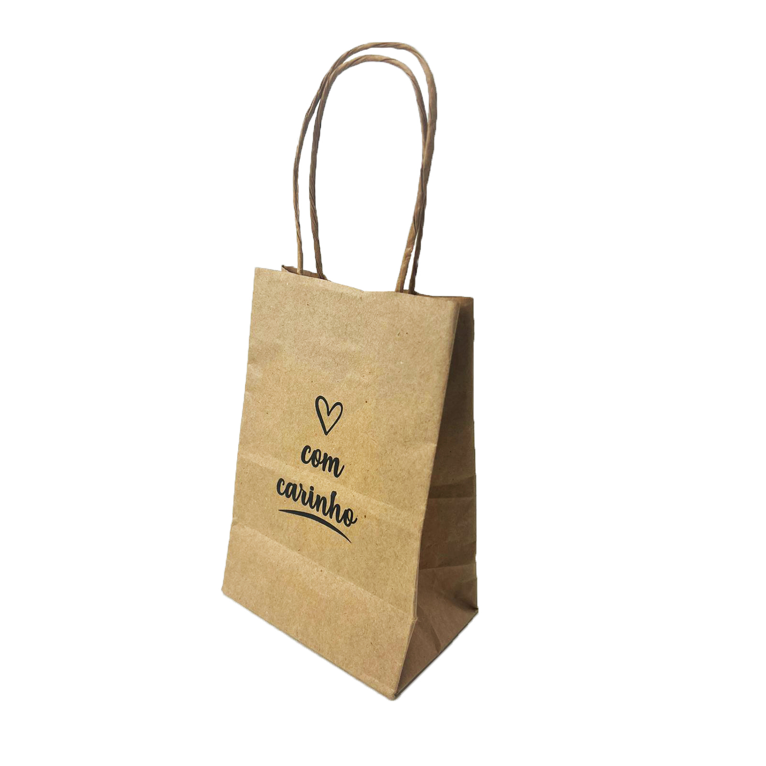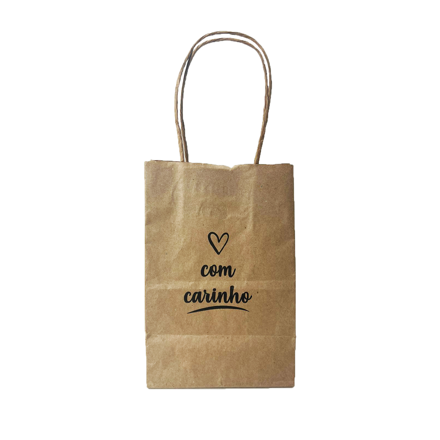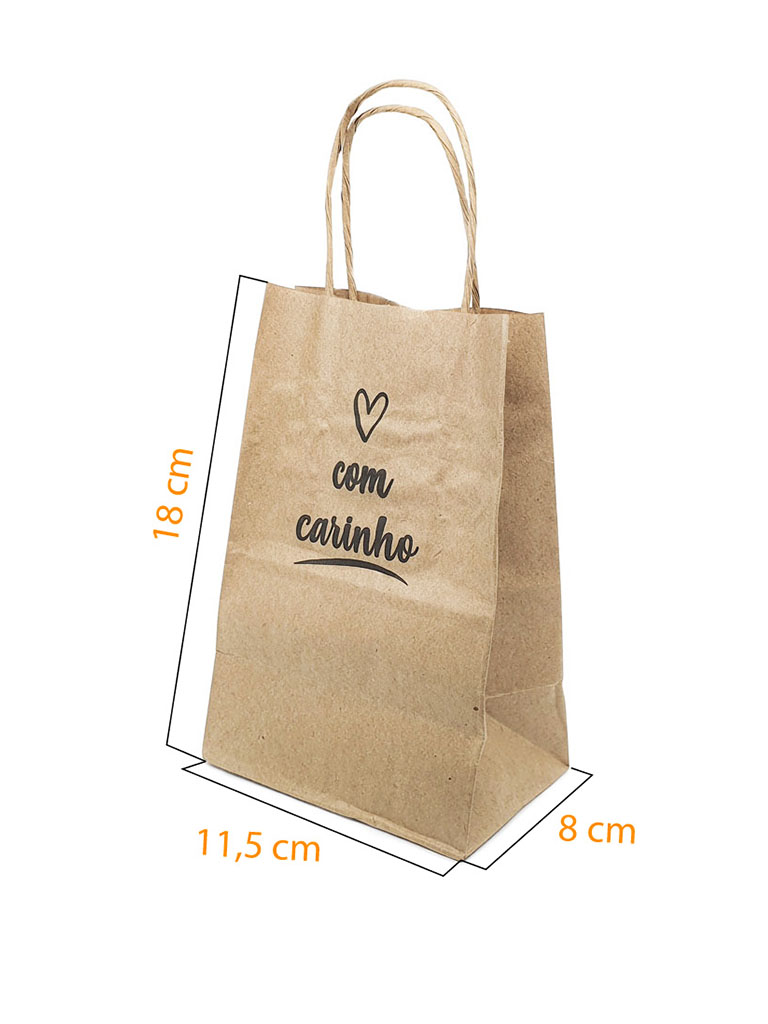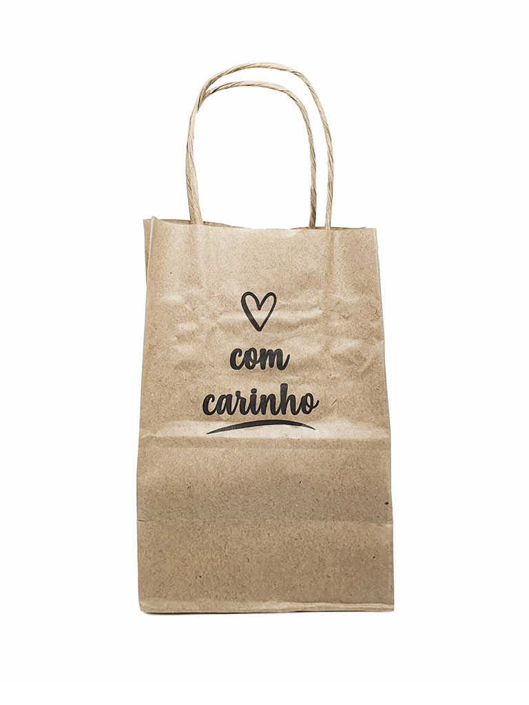 Sacola Kraft estampada com a frase “Com carinho”. Feita em papel kraft pardo 80 gramas. Ideal para bijuterias, pequenas lembranças, cosméticos, doces e produtos em geral.