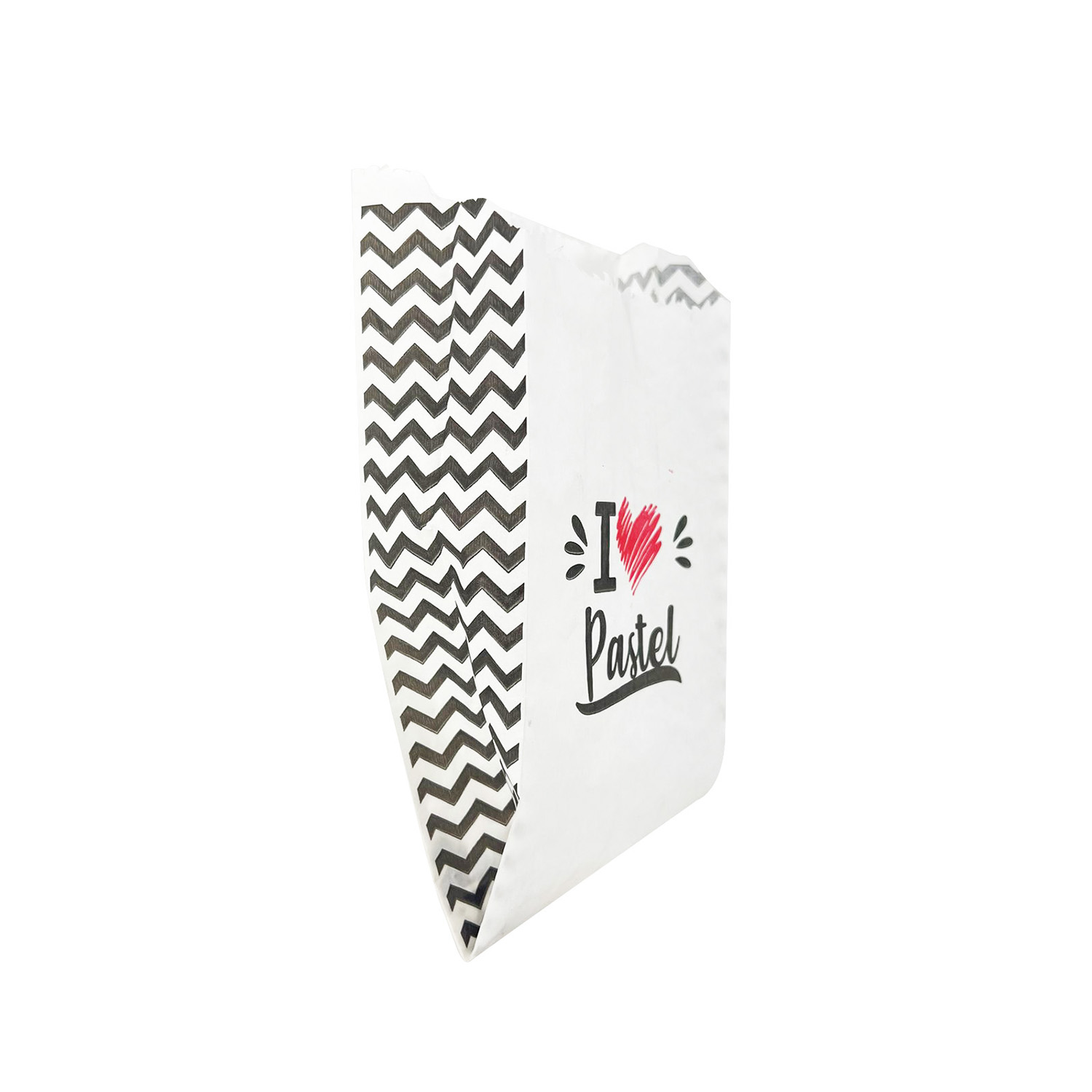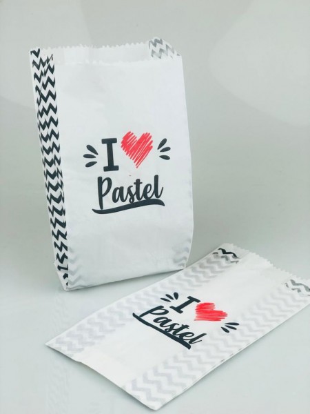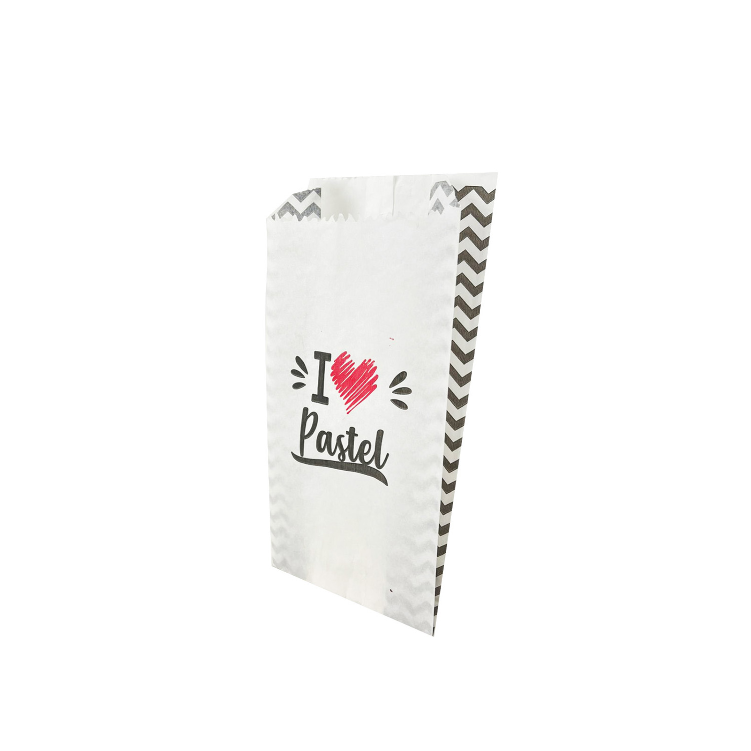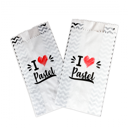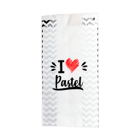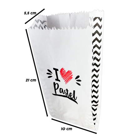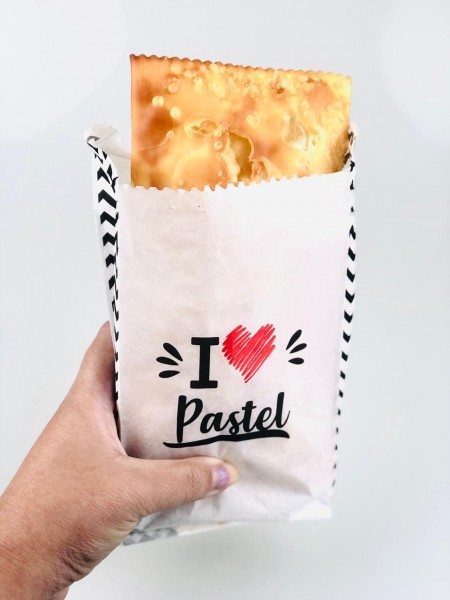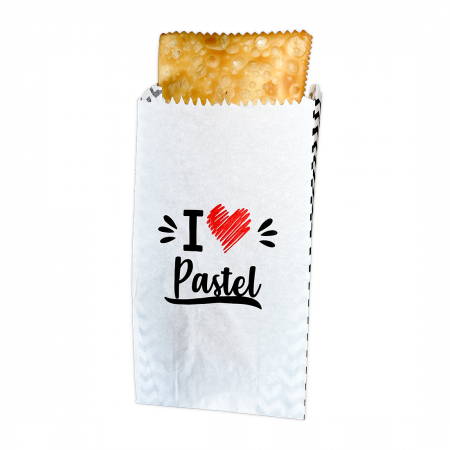 O design é pensado para deixar o pastel ainda mais atrativo e saboroso, conquistando pela aparência. Vem com a frase “I (coração) pastel”, com impressão de alta qualidade flexográfica, em duas cores: preto e vermelho. Esse saquinho protege, ajuda a manter a temperatura e a crocância.