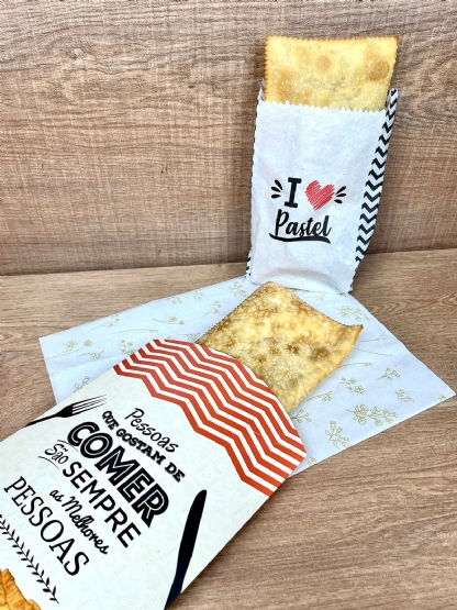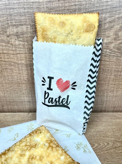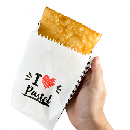 Este saco é realmente para quem ama pastel. É feito de papel antigordura 35 gramas, para criar uma camada de proteção entre o óleo e as mãos, evitando que ele escorra.